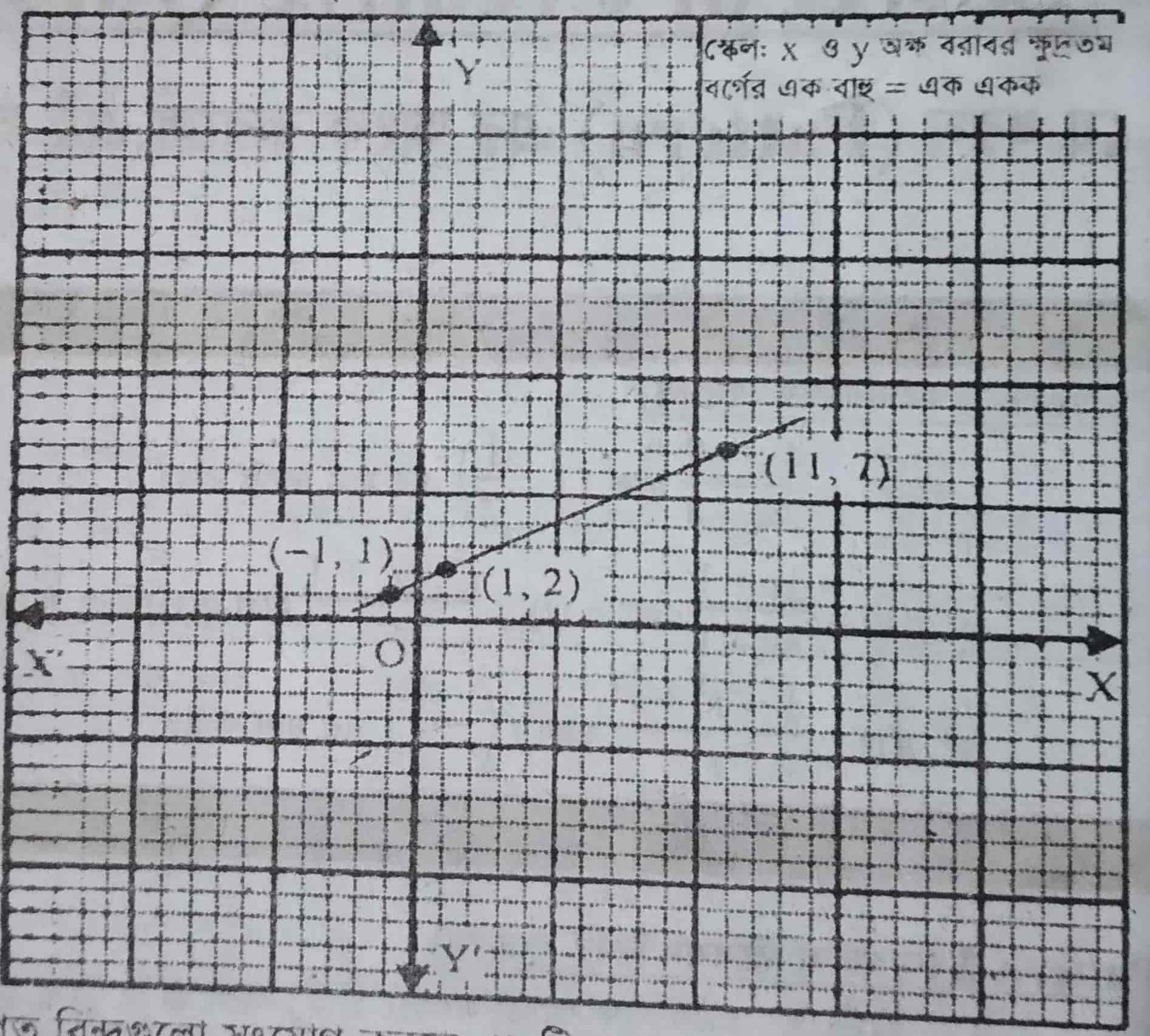 ২০। ছক কাগজে (1,2), (-1)1), (11,7) বিন্দু তিনটি স্থাপন করে দেখাও যে, বিন্দু তিনটি একই সরলরেখায় অবস্থিত।